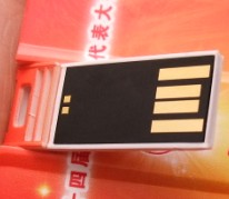 卡片U盤可以印刷正反兩面圖案,適合做禮品贈送。看U盤可以發(fā)現(xiàn)有一個掛繩孔,把小孔處翻轉(zhuǎn)一下,就可以看到黑膠體芯片,直接插入電腦USB口即可使用(如果你不知道卡片U盤怎么使用的話,可以打開視頻鏈接: /html/Upwd/1457_373.html)。攜帶方便,可以裝在錢包或名片夾里,為商務辦公提供及大的方便。